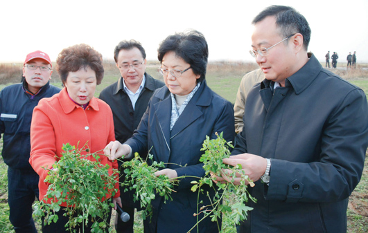 3日下午,李斌一行首先來到位于五河縣朱頂鎮(zhèn)的全國最大的紫花苜蓿生產(chǎn)基地——秋實草業(yè)有限公司調(diào)研。在市委書記周春雨、代市長白金明的陪同下,李斌深入田間察看牧草長勢,當(dāng)她得知牧草品質(zhì)上乘,草場機械化作業(yè)達(dá)到世界先進(jìn)水平時,不住地點頭稱贊。調(diào)研中,李斌和在這里打工的女拖拉機手、朱頂鎮(zhèn)小柳村村民劉小紅拉起家常,希望她通過自己的努力過上更加幸福美好的生活。